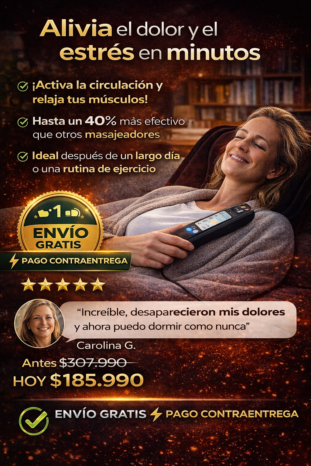 Con 3 niveles de intensidad ajustables y calor terapéutico integrado, es ideal para después de un largo día de trabajo, ejercicio o cuando simplemente necesitas desconectarte.