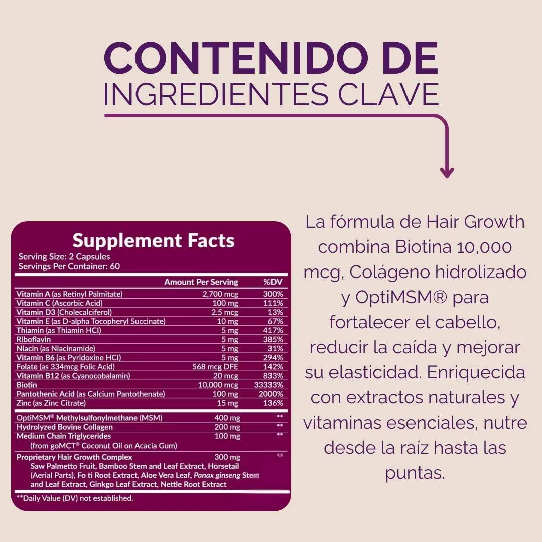 Contiene ingredientes seleccionados que apoyan la salud capilar, nutriendo desde el interior. No es mágico, pero puede favorecer un cabello más fuerte en combinación con buena alimentación y cuidados externos.